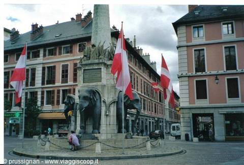 Orientarse en Chambéry es sencillo por lo pequeño de su casco histórico. Tomando la rue Sommeiller desde la estación se accede a la place du Centenaire y el boulevard de la Colonne, en donde se encuentra la Oficina de Información y Turismo. Un poco más adelante se alza la famosa Fontaine des Elèphants, levantada en 1838, en honor del general De Boigne. Esta fuente se ha erigido en el emblema de la ciudad.
