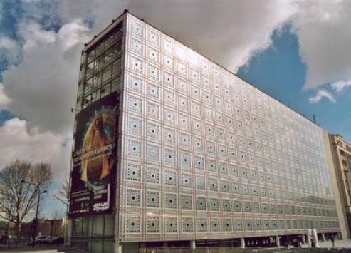 El edificio, que se integró perfectamente con el plano urbanístico que Haussmann trazó en el boulevard St-Germain, fue terminado en 1987 según un proyecto de los arquitectos J.Nouvel, P.Soria y G.Lezenes. Construido con vidrio y acero, es una síntesis entre la cultura musulmana y la occidental, entre la tradición y la modernidad.