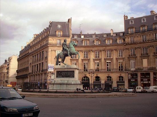El mariscal de la Feuillade, deseoso de agradar a Luix XIV, hizo urbanizar la plaza de las Victorias, levantando una estatua a pie del rey realizada por Desjardins. Fue inaugurada en 1686. La estatua desmontada durante la Revolución fue sustituida en el siglo XIX por una escultura ecuestre del rey, realizada por Bosio.