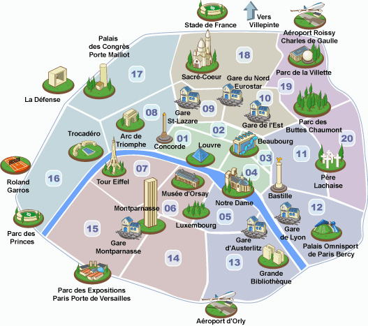 París está compuesta por 24 quartiers (barrios) y 20 arrondissements (distritos), éstos últimos dispuestos en forma de espiral empezando desde el centro y numerados siguiendo el sentido de las agujas del reloj, lo que falicita en todo momento la orientación.